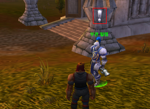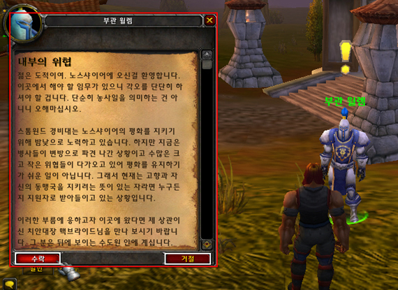 ▲NPC 머리위의 `노란 느낌표`는 퀘스트를 주는 NPC입니다. 냉큼 달려가 마우스 우클릭하면 퀘스트를 받을 수 있습니다