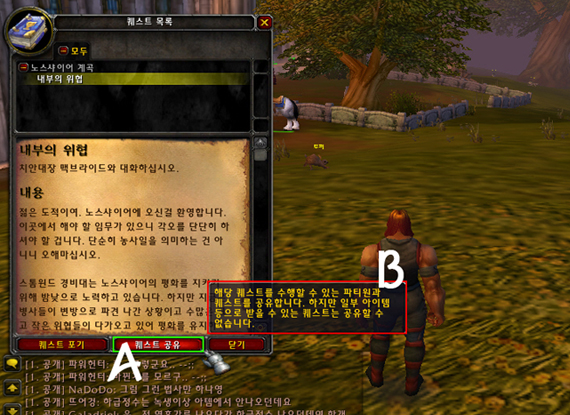 ▲키보드 L(영문 엘)을 누르면 `퀘스트 목록` 창이 뜹니다. A라고 표기된 `퀘스트 공유`를 클릭하면 파티원에게 공유신청이 갑니다. B표기는 퀘스트 공유에 대한 도움말 입니다.