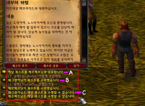 ▲ 채팅창에 퀘스트 공유에 관련된 메세지가 출력됩니다
