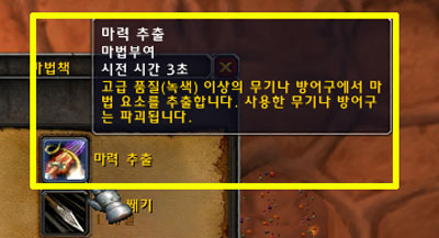 2. 아이템을 바꾸게 될때 전에 착용한 아이템을 마력 추출하는 방법이다. 현재 대부분의 아이템이 착용 시 귀속이나 획득 시 귀속이다. 그런 이유로 보다 좋은 장비로 바꿀 경우 전에 쓰던 아이템을 대부분 상점에 팔게 된다. 이런 경우 고레벨의 아이템일수록 고급 마법 부여에 들어가는 재료가 나오게 된다. 이런 귀한 재료를 단지 상점 아줌마에게 던져버린다면 얼마나 큰 낭비인가!? 이런 경우 마력 추출로 가루(정수)를 뽑아내 직접 마법 부여의 재료로 사용 해보는 것은 어떨까?