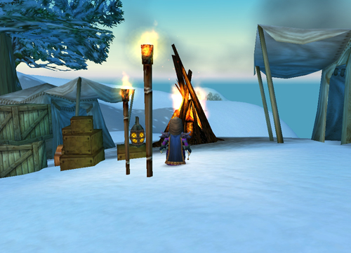 자아 이 고지에서 안전하게 뛰어내리면, 이 고지를 정복하기 위한 베이스캠프처럼 보이는 텐트가 있습니다. 불도 활활 타고 있고 텐트도 아늑해 보이는데, 사람이 없네요. 저 꼭대기의 해골과 관련이 있는 걸까요?