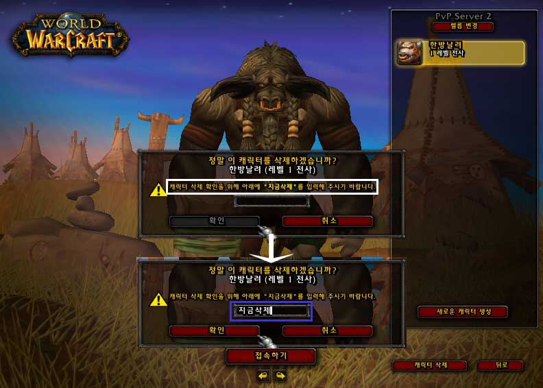 캐릭터를 삭제하기 위해서는 `지금삭제`라고 써야만 확인 버튼이 활성화된다