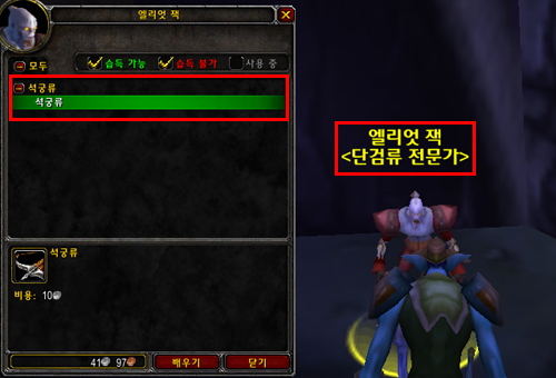 현재 장착 무기를 배우게 되면 맨손 전투 숙련도가 오르게 되는데 아직 GM의 답변을 듣지 못해 정확한 이유는 모르겠다. -_-; 그리고 호드 진영 언더시티 5시 방향에 있는 석궁 전문가가 겉모습이 단검 전문가로 나오고 있다. -_-; 속지 마시길!!