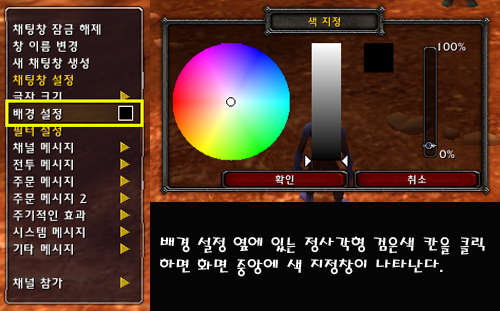 색 지정창을 이용해서 채팅창 배경 색깔과 명암을 조정할 수 있다