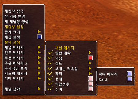 모든 종류의 채널 메시지의 색깔을 지정할 수 있다. 기본적인 대화, 감정 표현 그리고 귓속말에 이르기까지 자신이 바꾸고 싶어하는 모든 종류의 메시지를 바꿔줄 수 있다. 특히 파티창과 공격대창의 색깔은 바꿔주는게 좋지 않을까? 또한 자신이 원하는 메시지만 출력 할 수 있다. 메시지를 클릭해서 V체크 표시를 없애주면 해당 메시지는 채팅창에 출력 되지 않는다. 거래채널은 대도시에 들어가야만 색깔 설정을 할 수 있다.