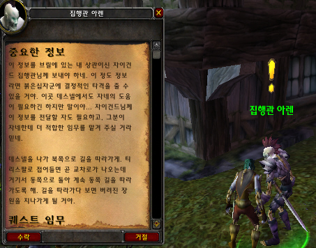 집행관 아렌은 `붉은십자군 전령`퀘스트를 해결하면 중요한 정보퀘스트를 주는데 브릴로 이동하라는 퀘스트야 이제 데스넬과 빠빠이 하는거지. 우리모두 초보 퀘스트를 빠르게 클리어 해서 새롭게 시작하는 초보들이 모내기 하지 않도록 데스넬을 떠나도록 하자~!!
