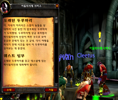 이곳에 들어가 어둠의사제 사비스를 보면 노란 물음표가 뜨는데 퀘스트를 해결해 줄테니 자기한테 오라는 표시야. 앞으로 이런 모습을 자주 볼 수 있으니 꼭 알아두도록해~ 힘들게 첫번째 퀘스트를 해결하면 다음 퀘스트인 넋 나간 좀비를 받을 수 있을거야 설레이는 마음으로 해결해 보자.