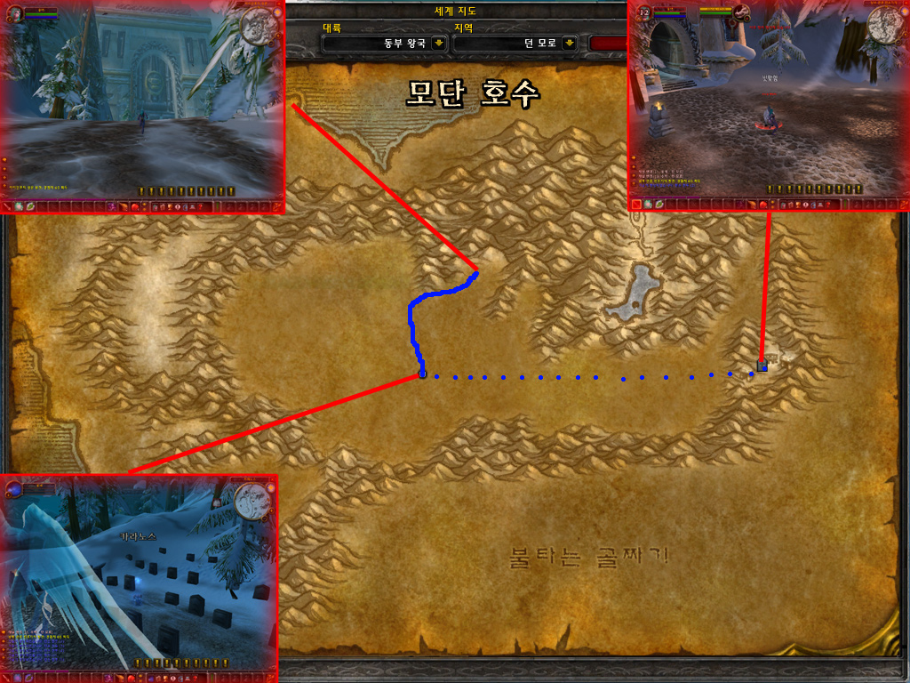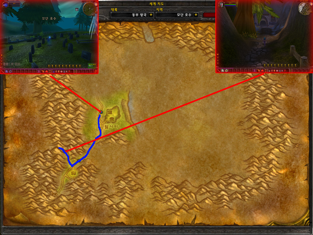 4) 유령이 된 곳은 저습지 중앙 무덤입니다. 부활한 뒤 파란 실선을 따라 이동합니다. 중간에 강력한 몬스터들이 많으니 조심해서 이동해야 합니다.