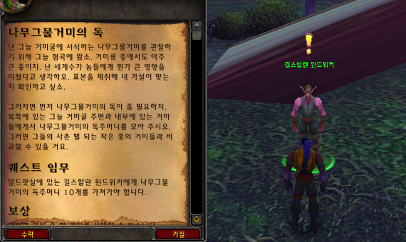 보상을 받으면 자연의 균형-2단계 암호화된 도장(도적은 도적 스킬을 가르쳐 주는 NPC를 찾아가면 된다)퀘스트를 받을 수 있다. 그런 뒤 관리인 일사레인을 앞에두고 북서쪽을 바라보면 길스할란 윈드워커 느낌표가 띄우고 있는 것을 볼 수 있을 것이다. 그와 대화를 통해 나무그물거미의 독퀘스트를 받으러 이동하자. 퀘스트의 자세한 진행은 링크되어 있는 퀘스트를 클릭하여 보면서 진행하면 쉽게 할 수 있다.