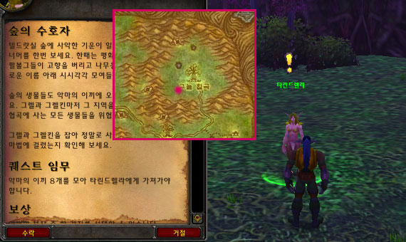 퀘스트를 수행하다 보면 관리인 일사레인에게 가는 길목에 타린드렐라가 보일 것이다. 그녀와 대화를 통해 숲의 수호자 완료하면 숲의 수호자-2단계 퀘스트를 받도록 하자.