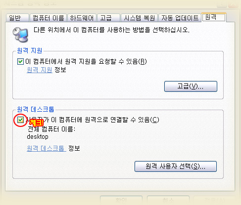 내 컴퓨터 등록정보의 구성 일반 | 컴퓨터 | 이름 | 하드웨어 | 고급 | 시스템 | 복원 | 자동 업데이트 | 원격 이중에서 우리가 필요로 하는 원격지 접속 기능은 가장 오른쪽에 있는 원격 탭 안에 있다. 원격 탭을 클릭하여 해당 페이지를 열자.