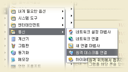 1) 원격지에서 외부 컴퓨터에 접속하기 시작버튼 > 모든 프로그램 > 보조 프로그램 > 통신 > 경로에 있는 원격 데스크톱을 실행시키면 원격 데스크톱 연결 프로그램이 실행된다.