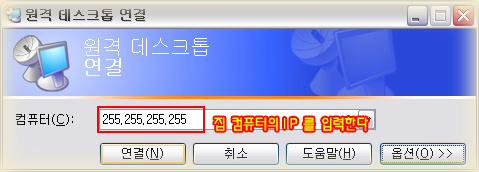 원격 데스크톱 연결이 실행되면 컴퓨터 필드에 집의 컴퓨터에 배당되어 있는 IP 주소를 입력한다. 만약 연결의 대상이 되는 컴퓨터가 원격지 접속을 허용한 상태라면 로그인을 요구하는 입력창이 새로 표시될 것이다. 이미 사용하고 있는 관리자 계정이나 미리 설정해둔 원격지 접속 권한의 제한된 계정을 입력하고 올바른 패스워드를 입력한다.