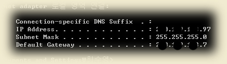 ipconfig.exe 창에 각종 정보가 출력될 것이다. 이들 중 필요한 것은 IP Address 부분이다. IP Adddress 부분은 최대 255의 값을 갖는 4단계의 숫자열로 표시될 것이다.