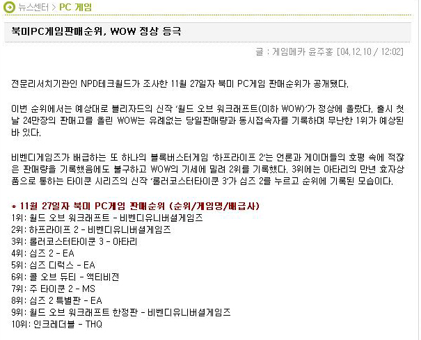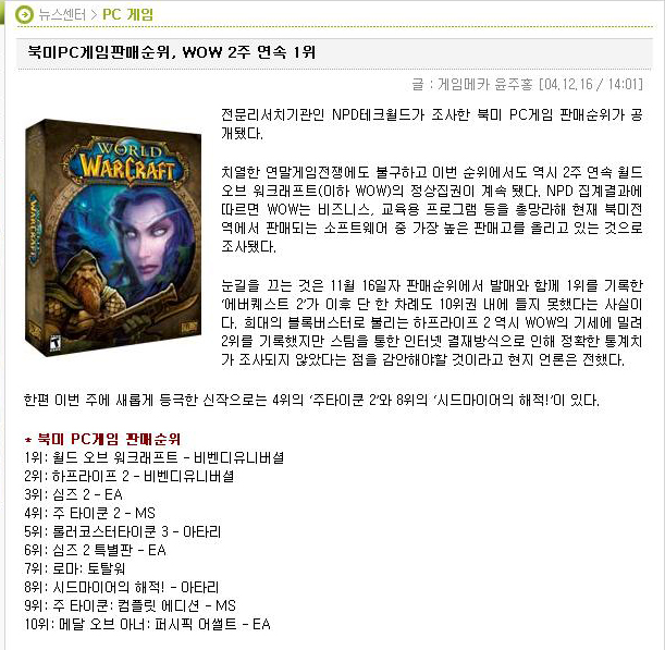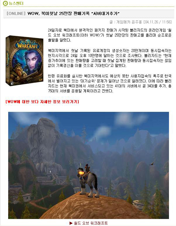 유저폭주로 인한 잦은 서버다운사태와 그로 인한 대기표의 등장으로 온라인게임도 줄서서 할 수 있는 시대가 왔음을 알린…(아닌가?) 그리고 서비스 시작 2주도 안되 신규유저 가입을 막아버린 초유의 사태를 불러온 게임 ‘월드 오브 워크래프트’(이하 WOW). 2004년 11월 12일 오픈베타 이후 보여주고 있는 WOW의 활약은 과거 국내에 상륙한 서구식 MMORPG들의 연이은 흥행참패와 비교하면 눈이 부실 정도다.