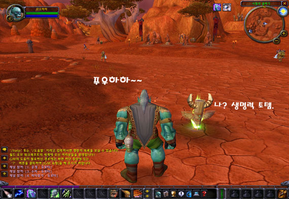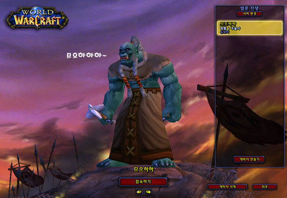 일단 게임을 시작해서 와우의 히어로인(개인적인 생각ㅡㅡ;) 오크를 선택 “므으하하”라는 다소 뻘쭘한 아이디로 캐릭터를 생성했다.