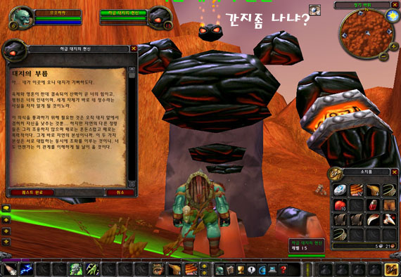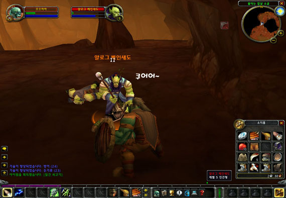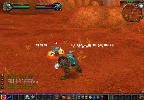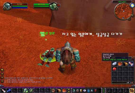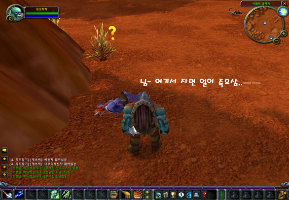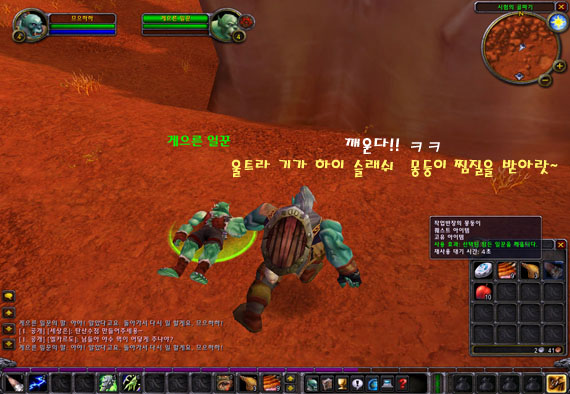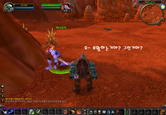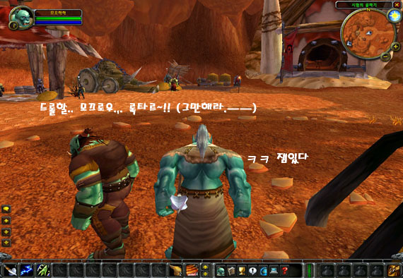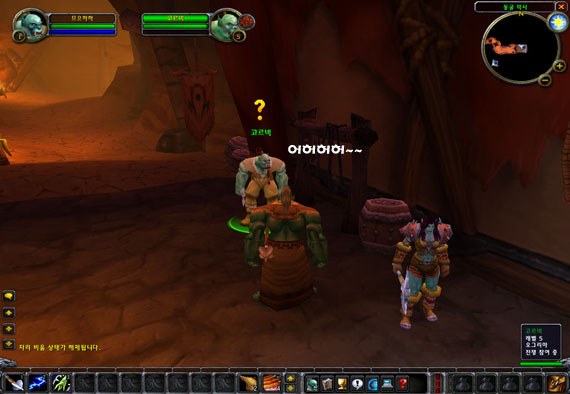 일단 바로 앞에 머리위에 느낌표가 붙은 칼툰크라는 오크에게 대화를 신청하려고 마우스 클릭을 했다. 아니 근데 이놈이 말을 걸때마다 이상한 소리만 한다.
