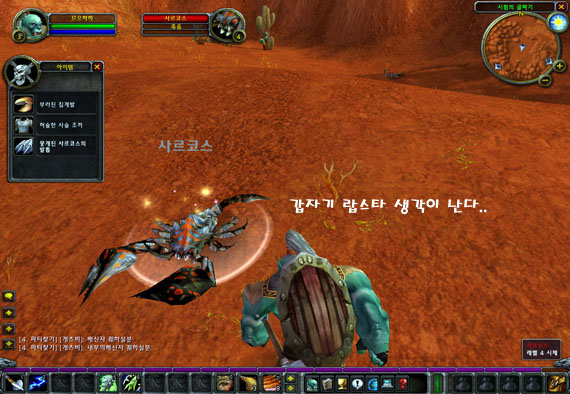 내용을 요약해 보니 대충 시크리크라는 오크와 대화를 나누고 전갈 10마리를 잡아오라는 내용 아까는 멧돼지더니 이번엔 전갈 10마리라..