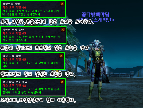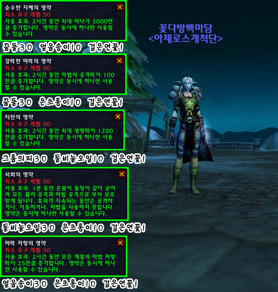 꽃다방백마담 : [티탄의 영약]은 검은바위첨탐 상층의 보스인 군주 드라키사스에게,[석화의 영약]은 스칼로맨스 라스 프로스트 위스퍼에게 얻었습니다. [순수한 지혜의 영약]은 스트라솔룸 수도원보스인 발나자르에게,그외 2개는 경매장에서 구했습니다.
