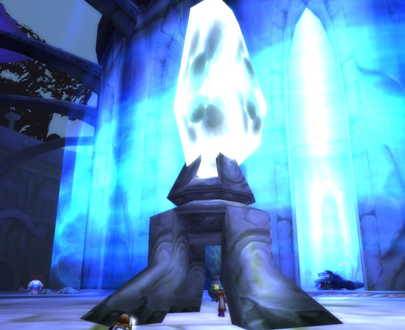 이렇게 계단을 따라 2층으로 올라가면 두번째 수정을 볼 수 있다. 첫번째 보았던 수정과 마찬가지로 정령들이 지키고 있으며 정령들을 다 처치하면 이 수정을 멈출 수 있다. 흑마법사가 있다면 "추방"을 사용하여 전사의 부담을 덜어 주어도 좋다.