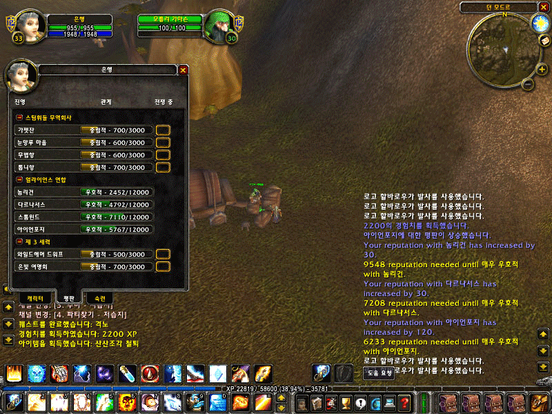아이언포지 관련 `격노`라는 퀘스트를 완료했을 때 모습니다. 놈리건과 다르나서스는 30 포인트(120 * 1/4)를 받았는데 스톰윈드는 제외된 것을 확인할 수 있습니다.