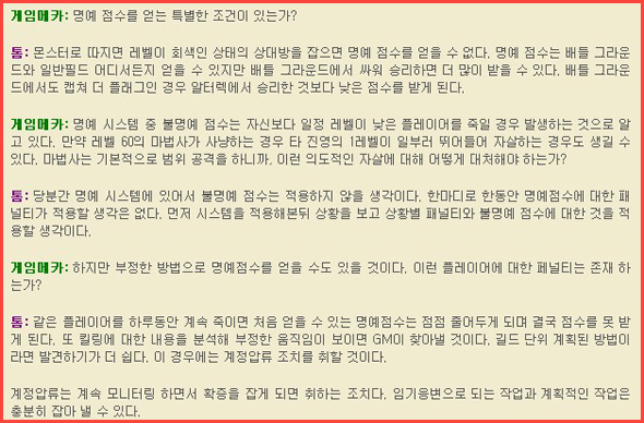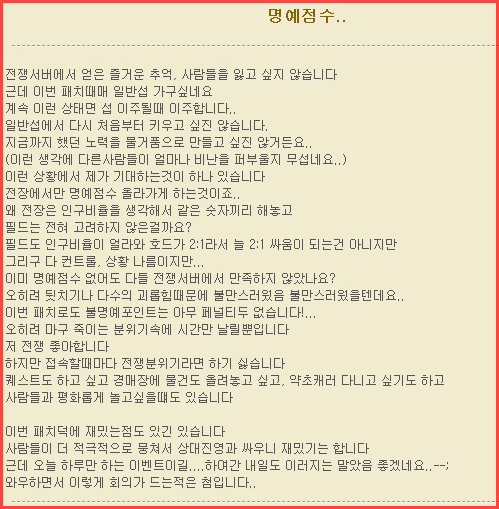 명예 시스템의 구현으로 좀 더 즐거운 분쟁을 유도하려 했지만 역시 예상되는 문제점이 고스란히 드러나 상당히 씁쓸하네요.
