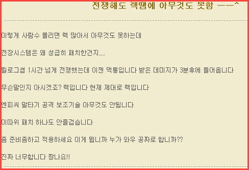 대규모 전쟁이 일어날 동기를 부여해놓고 그로 인해 유발하는 렉을 방치하였다 이로 인해 전쟁을 하는 유저들은 자신이 어떻게 죽었는지조차 확인이 불가능하다. 그리고 퀘스트를 하는 유저들도 렉으로 인해 충분히 상대할 수 있는 몬스터들에게 죽는 현상이 나타났다.