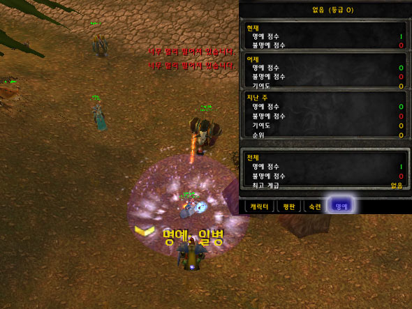 내가 한대라도 공격했던 얼라이언스 플레이어가 죽게 되면 명예 점수를 획득하게 되었고, 그 기록은 명예탭에 기록 된다. 또한, 명예 점수는 파티를 하고 있으면 인던 파티에서 경험치를 나누듯이 그 점수를 파티원들이 나눠서 획득 한다. 또한 현재 확인되는 명예 점수는 단순히 적 진영 플레이어를 죽인 횟수로만 기록되지만 1주일에 한번씩 점수를 환산해 등급이 오르거나 내려가게 된다고 한다. 보다 정확한 정보가 확인되기 위해서는 어느 정도 시간이 지나야 알수 있을거 같다.