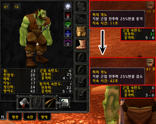 피의 격노 - 이제 15초 동안 기본 근접 전투력을 25%만큼 증가 시킵니다. 효과가 사라진 이후엔 45초 동안 근접 전투력이 25%만큼 감소합니다.
