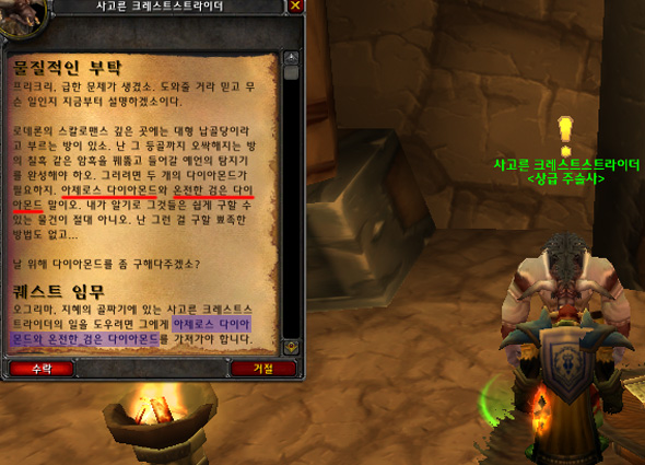 시작부터 예사롭지 않다 -_-;; 현재 퀘스트 아이템인 아제로스 다이아몬드와 온전한 검은 다이아몬드를 구하지 못해서 진행하지 못하고 있는 중! ㅠ_ㅠ 구하는대로 바로 시작해볼 것이다! 누가 무이자 할부로 저에게...;