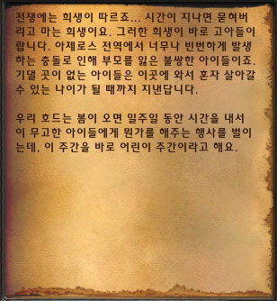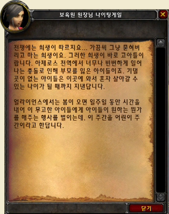 5월 1일을 시작으로 한 주 동안 오그리마와 스톰윈드에서는 어린이 주간을 기념하게 됩니다. 전쟁으로 고아가 된 어린이들에게 아무쪼록 따뜻한 손길을 베풀어 주시기 바랍니다.