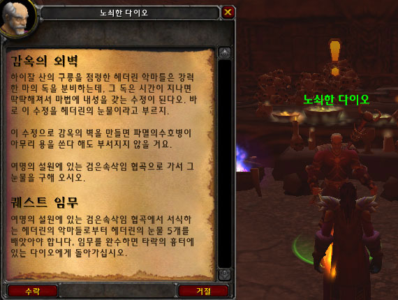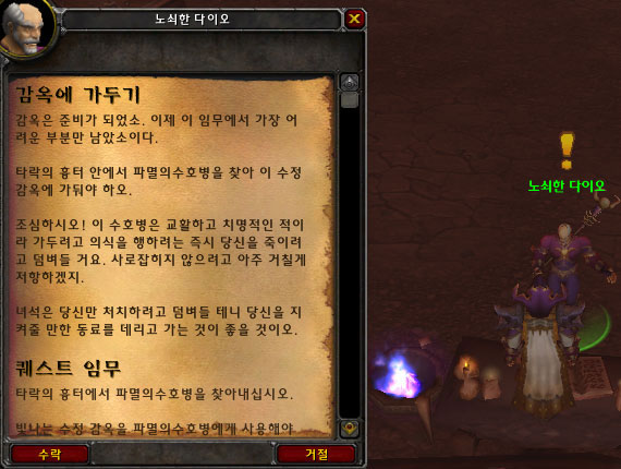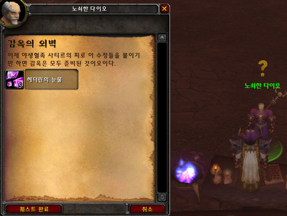 퀘스트 아이템인 헤더린의 눈물을 전부 모았다면 노쇠한 다이오에게 전달한다.(퀘스트가 감옥의 외벽외에 감옥벽의 재료도 있으니 2가지 퀘스트를 전부 해결한 뒤에 그에게 가져가자.)