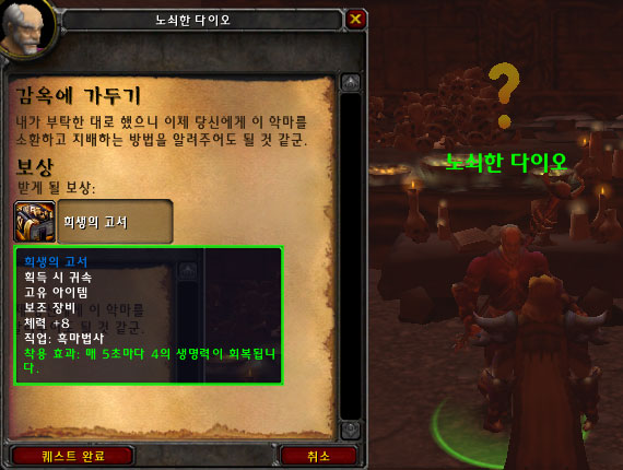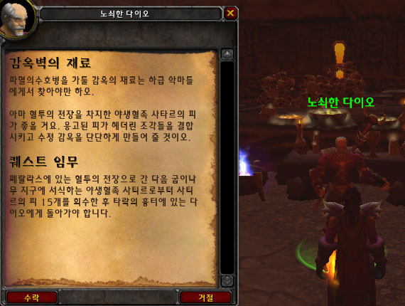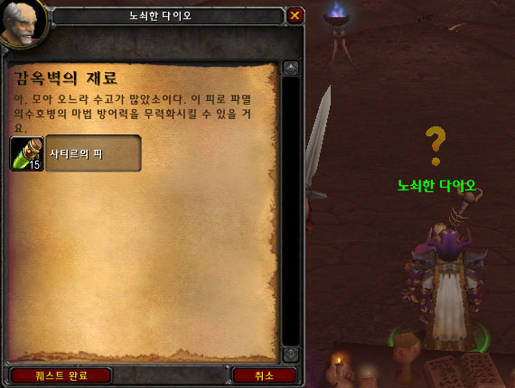사티르의 피를 다 모았으면 노쇠한 다이오에게 사티르의 피를 가져간다.(퀘스트가 감옥벽의 재료 외에 감옥의 외벽도 있으니 2가지 퀘스트를 전부 해결한 뒤에 그에게 가져가자.)