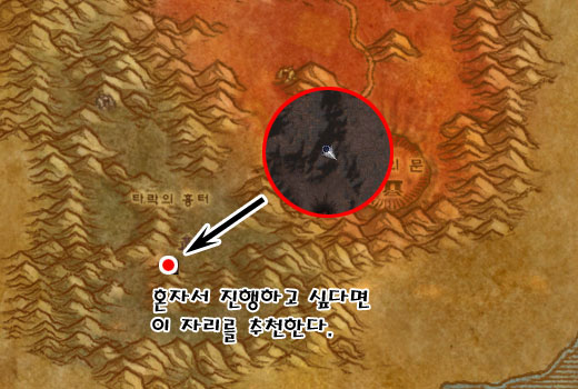 타락의 흉터는 몬스터가 맵에 빽빽이 들어차 있기 때문에 안전한 지역이 거의 없다. 하지만 지도에 표시한 위치는 파멸의 수호병이 시야에 보이면서 동시에 뒤쪽이 절벽으로 되어 있어서 몬스터가 위치하고 있지 않다.