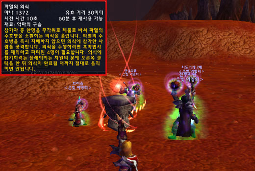 이제 파멸의 의식을 사용해보자. 필수 조건으로 소환의 매개체인 악마의 구슬이 필요하고 시전자를 제외한 파티원 4명이 필요하다. 즉 풀파티가 되어야 한다. 그외 파멸의 수호병 악마 지배 할 때 사용 할 영혼의 조각을 여유 있게 가지고 있자. 소환 의식을 시작하면 제단이 생성되고 모든 파티원을 제단을 클릭하여 의식을 도와야 한다. 이때 의식을 하는 모든 플레이어는 절대로 움직이면 안된다.