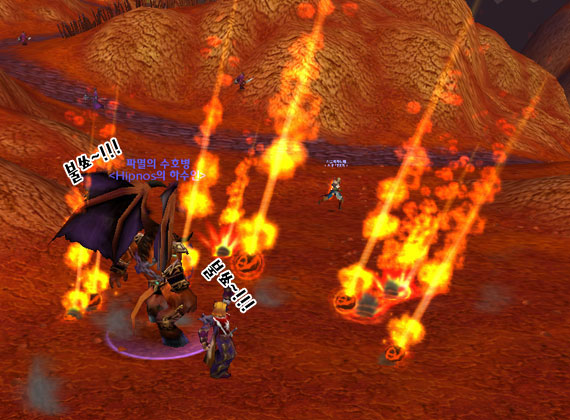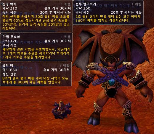 파멸의 수호병의 불의 비와 흑마법사의 불의 비를 동시에 사용하여 8초에 1800이란 광역 대미지를 줄 수도 있다. 하지만 아쉽게도 파멸의 수호병은 자신 주변에만 불의 비를 시전 할 수 있다.