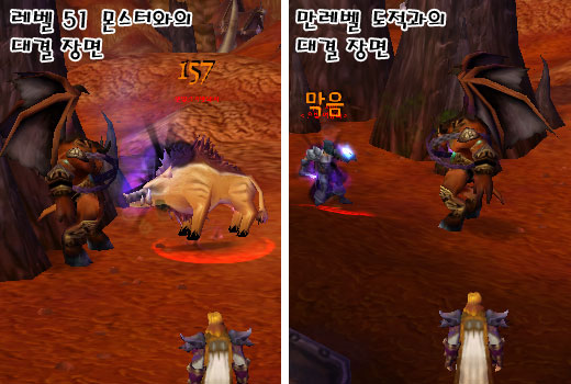 그리고 소환 의식을 도와주신 60레벨 도적과 PVP를 해보았다. 파멸의 수호병은 이미 많은 몬스터와 싸워 엠이 바닥을 보이는 상황이였다. 하지만 그 상황에서도 화려한 컨트롤을 자랑하는 60레벨 도적과 대결을 하여 체력을 절반 이상 닳게하는 강력함을 보여주었다.