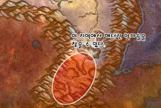 헤더린의 악마들은 여명의 설원 남쪽 검은속삭임 협곡에서 찾을 수 있다. 이 지역은 미 구현 지역인 하이잘산으로 들어가는 길목이라 현재 퀘스트가 없다. 그러니 일반 유저들의 도움은 기대하지 힘들다.