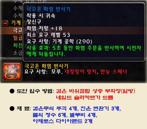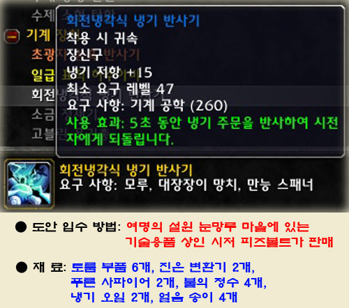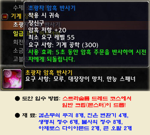 ▶ 사용 효과: 설명에 나와 있는 대로 반사기를 사용할 경우 시전자에게 해당 계열 마법을 되돌려주는 강력한 장신구이다. 재사용 시간은 5분 이며 화염이나 암흑, 냉기 마법이 날아오는 타이밍에 사용해도 반사가 가능하다. 저항력도 올려주는 반사기! 고유 아이템이 아니므로 2개를 만들어 모두 장신구에 착용하면 놀라운 저항력을 보여주는 물건이 않을까?! 치명타도 치명타로 되돌려준다는 반사기!! 정확한 실험은 할 수 없었지만 특성으로 나타나는 효과(마법사 화염의 충격 같은 경우)도 시전자에게 되돌려 줄지 의문이다. 또한 한번에 10명이 넘는 마법사가 동시에 날린 화염구도 되돌려줄지...? 생명석과 같다면 두 개의 저항력 효과는 볼 수 있어도 쿨타임이 같이 돌 것 이라는 공학도들의 말이 떠도는 가운데 정확한 실험을 할 수 없어 필자의 가슴에 한이 맺힌다. 재료의 압박이 심한 반사기를 보면서 침만 흘리고 있는 공학도도 있다.