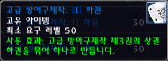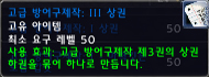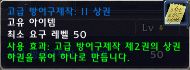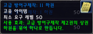▶ 발동 효과: 광범위(정확하게 실험하지 못했지만 전사의 천둥 벼락 정도의 범위라고 한다)하게 60~70정도의 대미지를 준다. 치명타로 들어갈 경우 90~100사이의 대미지를 준다. 광역 발동이므로 인던 파티에서는 양변이, 현혹등을 깨우게 되므로 사용을 절제하는 방패. 가장 큰 단점은 아이템 설명에도 있듯이 발동 효과가 터지는 순간 랜덤으로 내구도가 1씩 떨어지게 되므로 수리비 걱정이 우선인 방패 -_-;; 전장에서 많은 적을 상대 할 때 전사가 방패 막기를 활성화 시키고 일시적인 효과를 노릴수도 있지만 내구도 손상 속도가 엄청난 물건이라 활용도가 떨어진다. 내구도 손상이 다른 일반 방패 같다면 대박 방패!!