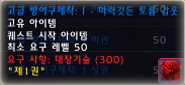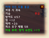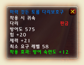 재료 - 지옥 옷감 2개. 지옥 옷감은 레벨 50이상의 악마형 크립(몬스터)가 주는데 이를 달샘에서만 변환이 가능하다. 달샘은 잿빛 골짜기, 달의 숲에 있으며 4일에 1번 변환이 가능하다.