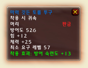 ▶ 부연 설명: 캐스터 계열은 천만 입을 수 있기 때문에 방어도보다 옵션을 더욱 중요시 한다(대부분이 그렇지만 -,.-;;). 때문에 대마법사 허리띠와 같은 옵션은 캐스터 계열에게 열열히 환영 받는 아이템이다. 지능과 체력 거기에 극대화 옵션까지 붙어 있어서 공격 마법의 치명타 확률이나 힐의 극대화 효과를 내주는 대마법사 허리띠! 재료에서 변환 기간이 오래 걸리는 달빛 옷감이나 의외로 구하기 힘든 유령 염료가 들어가는 점만 뺀다면 만들어 볼만한 에픽 허리띠다.