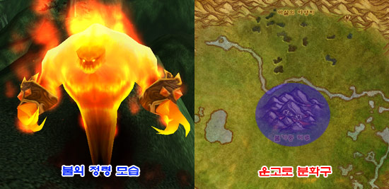 이곳에 나오는 불정령 종류는 총 두 가지로 사용하는 기술 또한 각각 다르다. 타오르는 정령의 경우 레벨 53~54정도로 마법사 기술인 불태우기(화염 대미지)를 사용한다. 불태우기는 시전 속도가 빠르기 때문에 시전 방해 기술이 있는 직업의 플레이어라면 즉시 끊어주도록 하자. 또 다른 불 정령은 레벨 54~55인 살아있는 불길이다. 이 정령은 마법을 사용하지 않지만 일반 공격과 함께 화염 보호막(흑마법사의 임프가 사용하는 버프)으로 주기적인 대미지를 주는 녀석이다. 마법 시전이 아닌 주기적인 연속 대미지는 타오르는 정령을 잡을 때보다 많은 체력을 소비하게 만든다.