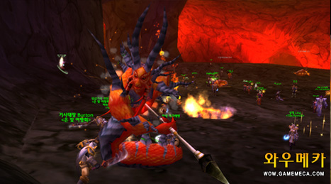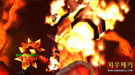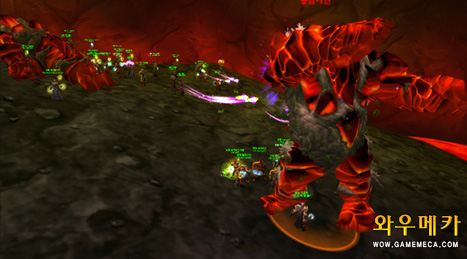 굽이치는 용암정령의 공격은 매우 특이하다. 몰려있는 공격대에 돌진하여 1,000정도의 대미지와 함께 뒤로 넘어뜨린다. 그렇기 때문에 산개해서 잡는게 효율적이다. 간혹 용암이 흐르고 있는 곳으로 떨어져 사고가 나는 경우가 많기 때문에 자신의 자리를 잘 확인하여 떨어지지 않도록 조심해야 한다. 너무 혼잡할 경우에는 흑마법사의 "추방"을 사용하여 진영을 다듬고 시작하는 것도 좋다.
