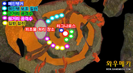 라그나로스 범위 공격은 밀쳐내기 속성을 가지고 있다. 범위 공격으로 인해 용암에 빠지는 공대원들이 많기 때문에 이 부분의 최소화하는 것이 라그나로스 공략의 핵심 이다. 이 부분의 피해를 최소화 하기 위해 개인 간격을 최대한 멀리 두고 지도와 같은 진영으로 라그나로스를 공격 한다. 특히 메인 탱커를 보조하는 힐러 9명의 전멸을 막기 위해 힐러들의 개인간격을 최대한 넓게 배치를 해야 한다. 3분이 지나 피조물들이 소환되면 둥지의 10시 방향 가장 넓은 지역으로 공격대 전체가 신속하게 이동하여 소환물들을 처리하면 된다.