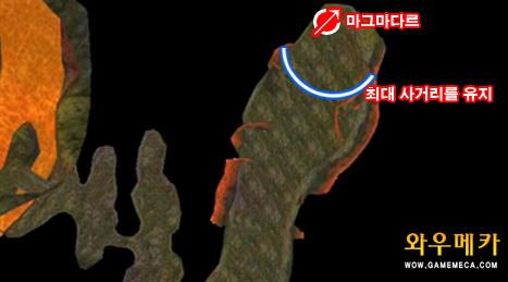 위 지도를 보면 화살표 방향으로 메인탱커가 마그마다르의 고개를 돌려놓고 원거리 공격이 가능한 플레이어들은 최대사거리를 유지하여야 한다. 최대사거리를 유지하는 이유는 마그마다르의 30초마다 시전하는 "공황"이라는 기술 때문이다. 이 기술에 걸리면 마그마다르 주변에 모든 플레이어들은 공포에 걸리게 된다. 이때 매인탱커와 그리고 사제들이 공황에 걸리면 상황이 매우 혼잡스럽게 되기 때문에 자칫하면 전멸로 이어진다. 그렇기 때문에 가급적이면 최대 사거리를 유지하여 공격하는 것이 좋다.