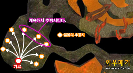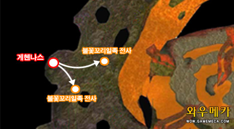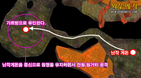 메인 탱커가 게헨나스를 끌고 벽쪽에서 몸빵(?)하는 동안 2, 3파티의 탱커들이 수호병 2마리를 뒤쪽의 넓은 곳으로 데려와서 각각 한 마리씩 맡고 어그로 시간을 가진 다음, 2파 전사가 맡은 불꽃 꼬리 일족▶ 3파 전사가 맡은 불꽃 꼬리 일족▶ 게헨나스 순으로 잡으면 된다. 이때, 2, 3파에 각각 전사2명을 두어서 한 명이 기절 당하면 다른 전사가 탱킹을 하는 방식이다.