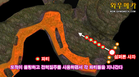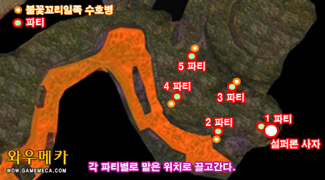 설퍼론사자는 힐을 하는 사제를 4마리 거닐고 있다. 따라서 왼쪽부터 차례대로 2파전사 - 3파전사 - 1파전사 - 4파전사 - 5파전사가 하나씩 타겟을 미리 정해놓고, 사냥꾼이 가장 오른쪽 몹을 풀링하면 5명의 전사들은 일제히 달려나가서 타겟잡은 몹을 끌어온다.
