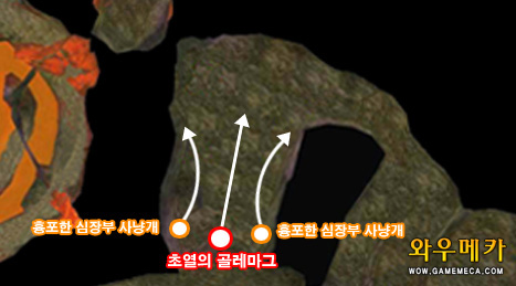 초열의 골레마그는 양 옆에 흉포한 심장부 사냥개가 2마리를 있다. 이 흉포한 심장부 사냥개는 처치해도 다시 초열의 골레마그에 의해 살아나므로 흉포한 심장부 사냥개는 2 - 3파티 전사들이 각각 한마리씩 맡아서 양 옆으로 멀리 끌고간 뒤에 초열의 골레마그를 잡을 때까지 버텨야 된다. 그리고 1파티 전사는 초열의 골레마그를 맡고 다른 이들은 모두 골레마그를 집중 공격하여 잡는 방식이 일반적이다.