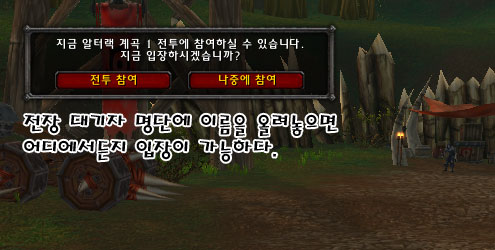참여와 전장 입장 2가지를 고를 수 있는데 전장 입장은 누구나 사용가능하고, 전체